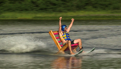 Kevin and Andrew combine the typical cottager’s two most favourite activities — water sports and relaxing on deck chairs — to come up with The Chair-Ski.
