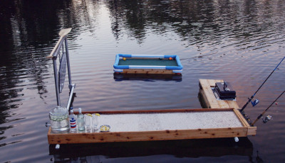 Inspired by the swim-up bars at Caribbean resorts, Andrew and Kevin set out to construct one of their own at their lakeside cottage property, highlighted by underwater seating, a floating pool table and a gleaming bartop made entirely out of nickels.