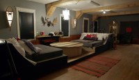 For our indoor outdoor bathroom, we’re gonna start byopening up the old lath and plaster walls and cladding the exposed studs with long bark slabs, fresh from the lumber mill. Our sink will be a rustic natural feature complete with a rock basin, a custom built copper flue and faucet, and fronted by a green living wall.Continuing with the stone theme, we’ll add additional touches like a grey slate backsplash and tile floor. A flagstone shelf, and a new stone-wrapped toilet. On the walls we’ll turn a photo of the woods into a wall mural to add depth and to create the illusion that we’re in the forest, while high above we’ll utilize another bark slab to create a homemade hanging chandelier. We’ll finish it off with a new entranceway complete with a barnboard door and a light up crescent moon, making this the perfect homage to the cottage outhouse, in the house.