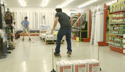 The boys are let loose in a local TIMBER MART store and the brothers make “land” curling stones.