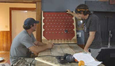To get their disc golf game going, Andrew and Kevin are building a disc golf basket that doubles as a beautiful industrial-style crokinole table.
